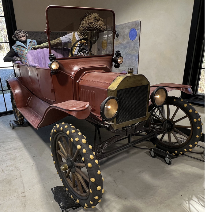 Faducci sculpture titled “Joy Ride” is a 1916 Model T Ford chassis with an Iguana driving and a chimpanzee in the rear seat. The sculpture is designed to be interactive with the public able to climb into the car and interact with the sculptures.